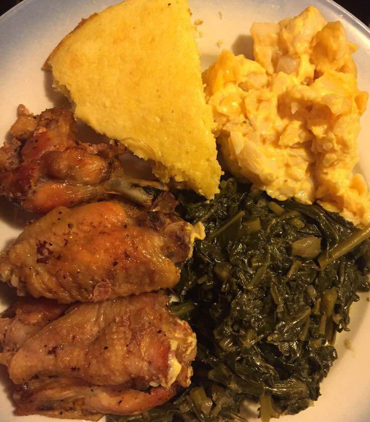 Juicy, seasoned chicken wings paired with savory collard greens and a slice of cornbread.